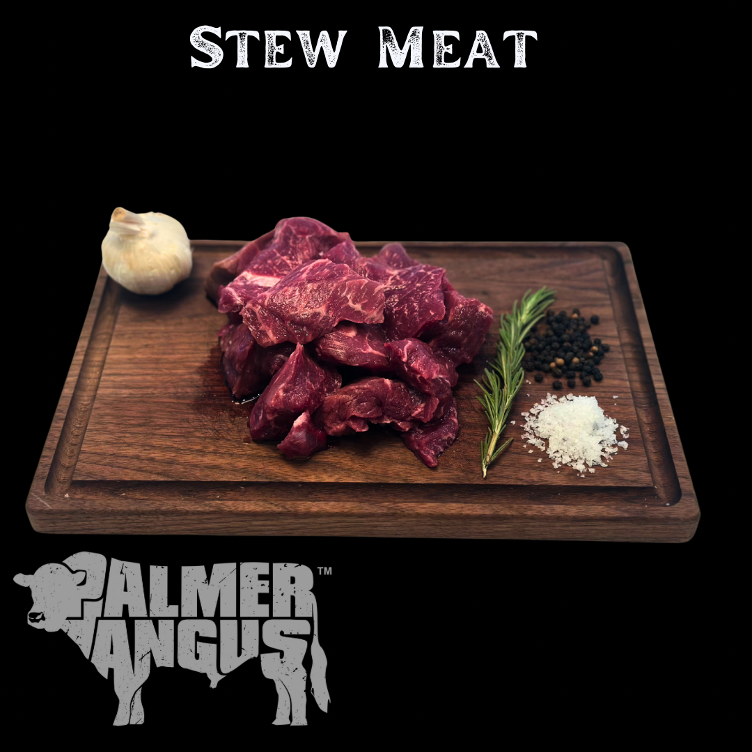 Enjoy the flavor of Palmer Angus beef with a comforting stew. This is conveniently precut and these are packaged in a 1lb vacuum sealed pack. Palmer Angus cattle are grass fed most of their lives, and finished on grain for that steakhouse flavor and marbling.